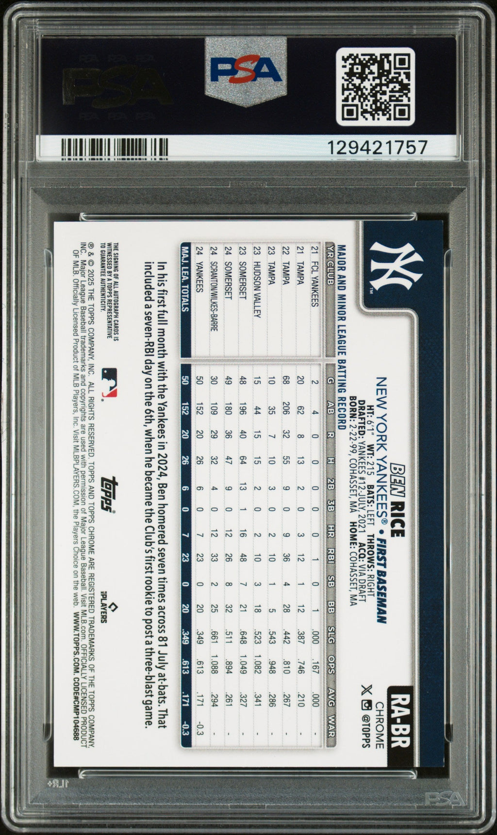 2025 Topps Chrome Rookie Autographs Ben Rice Rookie PSA 9 MINT New York Yankees Don’t miss your chance to own this highly sought-after 2025 Topps Chrome Rookie Autographs card featuring Ben Rice of the New York Yankees! This card is autographed by Ben Rice and professionally graded PSA 9 MINT, making it a standout piece for any serious baseball card collector or Yankees fan. With only 46 in the population and just 3 graded higher, this is a rare opportunity to add a top-tier rookie card to your collection. This officially certified card (Certification Number: 129421757) comes from the exclusive 2025 Topps Chrome Rookie Autographs set and boasts the coveted rookie status. Secure this investment-grade collectible today and celebrate the excitement of Ben Rice’s promising career with the Yankees! Autographed: Yes Set: 2025 Topps Chrome Rookie Autographs Signed By: Ben Rice Certification Number: 129421757 Grader: Professional Sports Authenticator (PSA) Player/Athlete: Ben Rice Grade: 9 Year Manufactured: 2025 Graded: Yes Sport: Baseball Population Higher: 3 Manufacturer: Topps Population: 46 Team: New York Yankees Features: Rookie Card Number: RABR Listed With Mascot.
