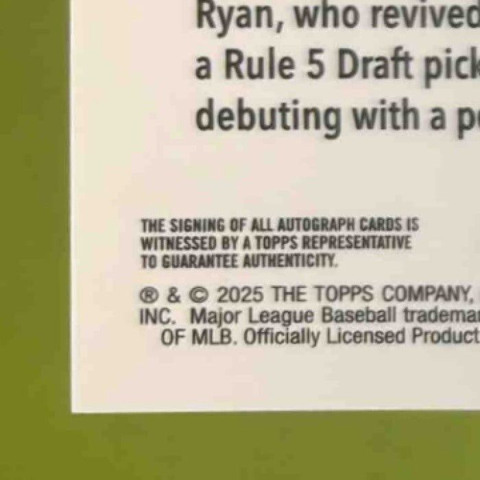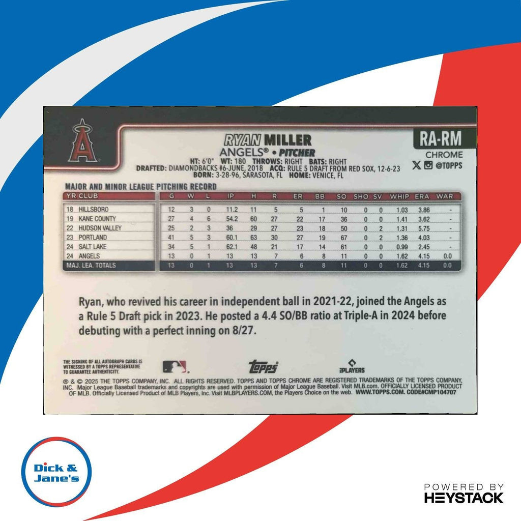 The 2025 Topps Chrome Ryan Miller Rookie Auto Aqua Wave /199 RC card is a highly sought-after collectible for Los Angeles Angels fans. This rare card features a stunning aqua wave design and is autographed by the rising star. Limited to only 199 copies, this card is a must-have for any serious sports trading card collector. Get your hands on this unique piece of MLB memorabilia before it's gone! Listed With Mascot.