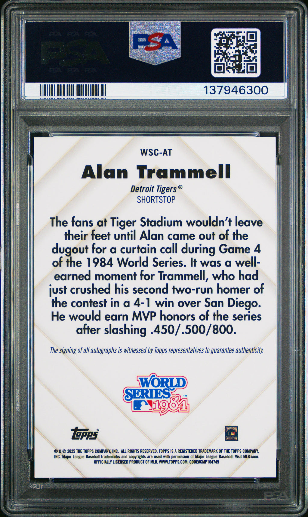 2025 Topps Chrome World Series Champions Auto Alan Trammell /100 PSA 9 MINT Don’t miss your chance to own this rare 2025 Topps Chrome World Series Champions Autographs card featuring Detroit Tigers legend Alan Trammell! This stunning card is hand-signed by Trammell and professionally graded PSA 9 MINT, ensuring top-tier quality and authenticity for your collection. With only 100 serial-numbered copies produced and just 3 graded at this level—with none higher—this is a true gem for serious baseball card enthusiasts and Tigers fans alike. Certified with PSA and boasting a unique serial number (086/100), this card stands out as a must-have collectible from the iconic Topps Chrome set. Secure this limited-edition autographed card today and celebrate a Hall of Famer’s World Series legacy—add it to your collection before it’s gone! Autographed: Yes Set: 2025 Topps Chrome World Series Champions Autographs Signed By: Alan Trammell Certification Number: 137946300 Grader: Professional Sports Authenticator (PSA) Grade: 9 Player/Athlete: Alan Trammell Year Manufactured: 2025 Serial Number: 086/100 Graded: Yes Sport: Baseball Population Higher: 0 Manufacturer: Topps Population: 3 Team: Detroit Tigers Card Number: WSCAT Listed With Mascot.
