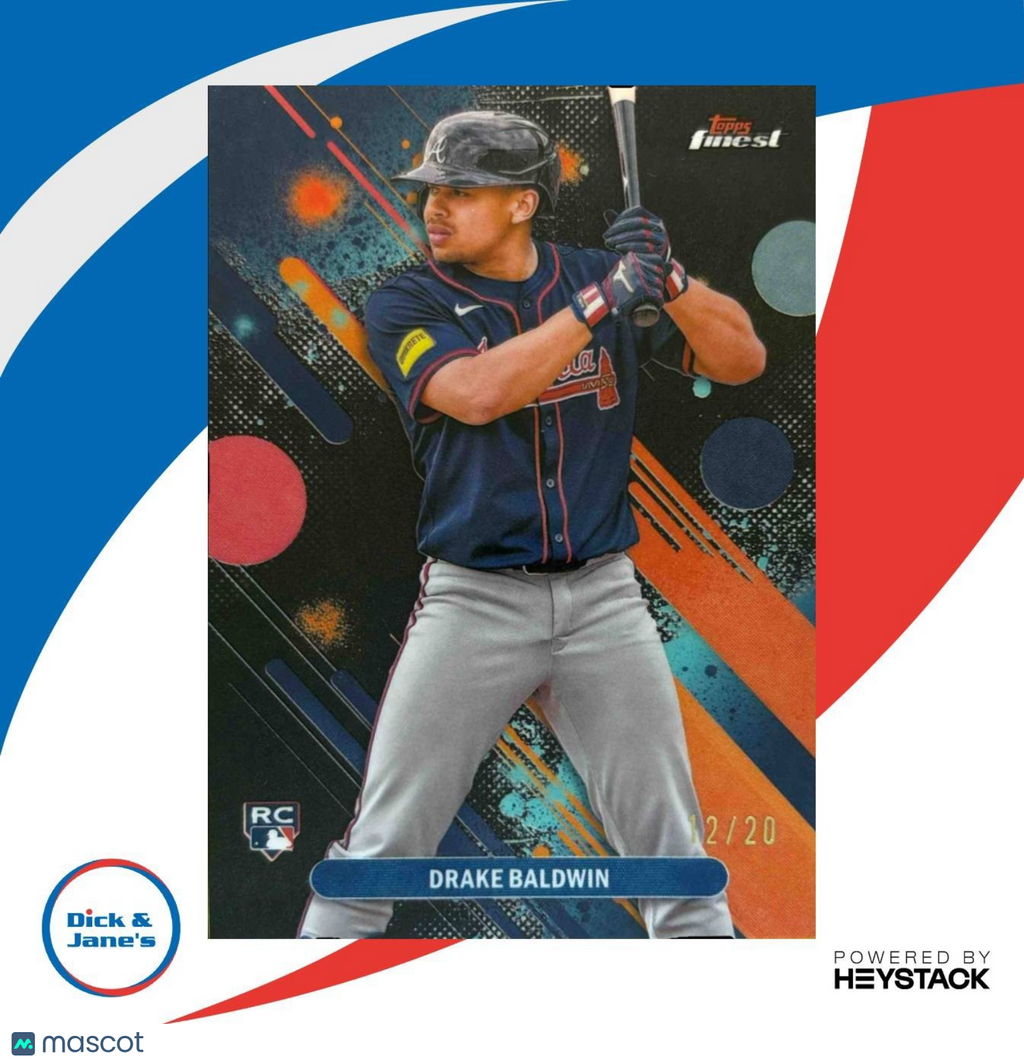 Add this rare 2025 Topps Finest Drake Baldwin MLB rookie card to your collection! This Common Black Refractor is numbered /20 and features the talented Atlanta Braves player. Don't miss out on owning this exclusive RC card of a future star. Listed With Mascot.