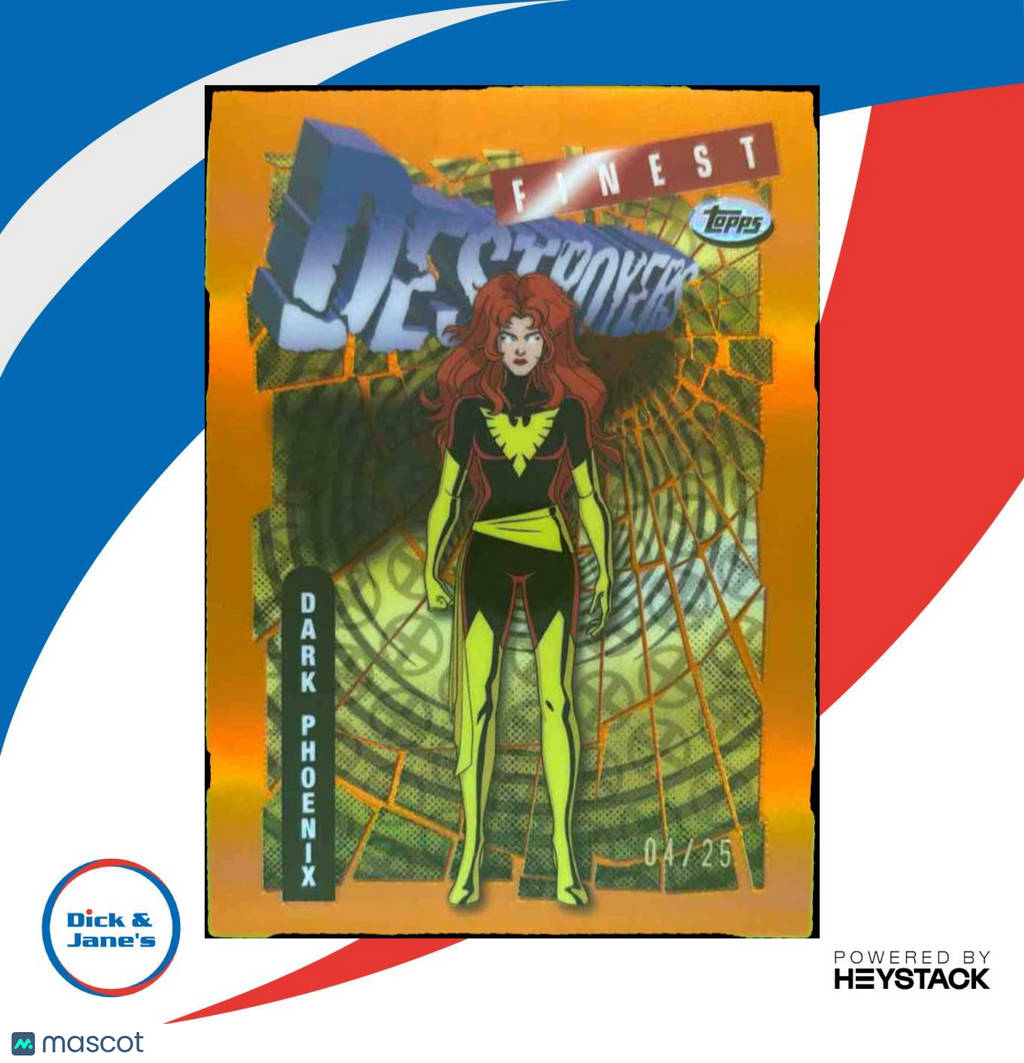 This rare 2025 Topps Finest X-Men '97 Dark Phoenix Orange Refractor /25 #87 trading card features a stunning design depicting the iconic Dark Phoenix character. Limited to only 25 copies, this highly sought-after collectible is a must-have for any X-Men fan or trading card enthusiast. Don't miss your chance to own a piece of comic book history! Listed With Mascot.