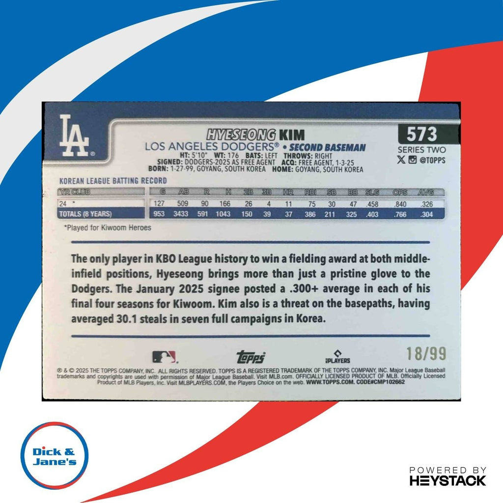 Own a piece of baseball history with the 2025 Topps Hyeseong Kim Green Holo Foil RC card #573. Limited edition 18/99, this rare gem showcases the Los Angeles Dodgers rising star. A must-have for any collector or Dodgers fan. Get it now before it's gone! Listed With Mascot.