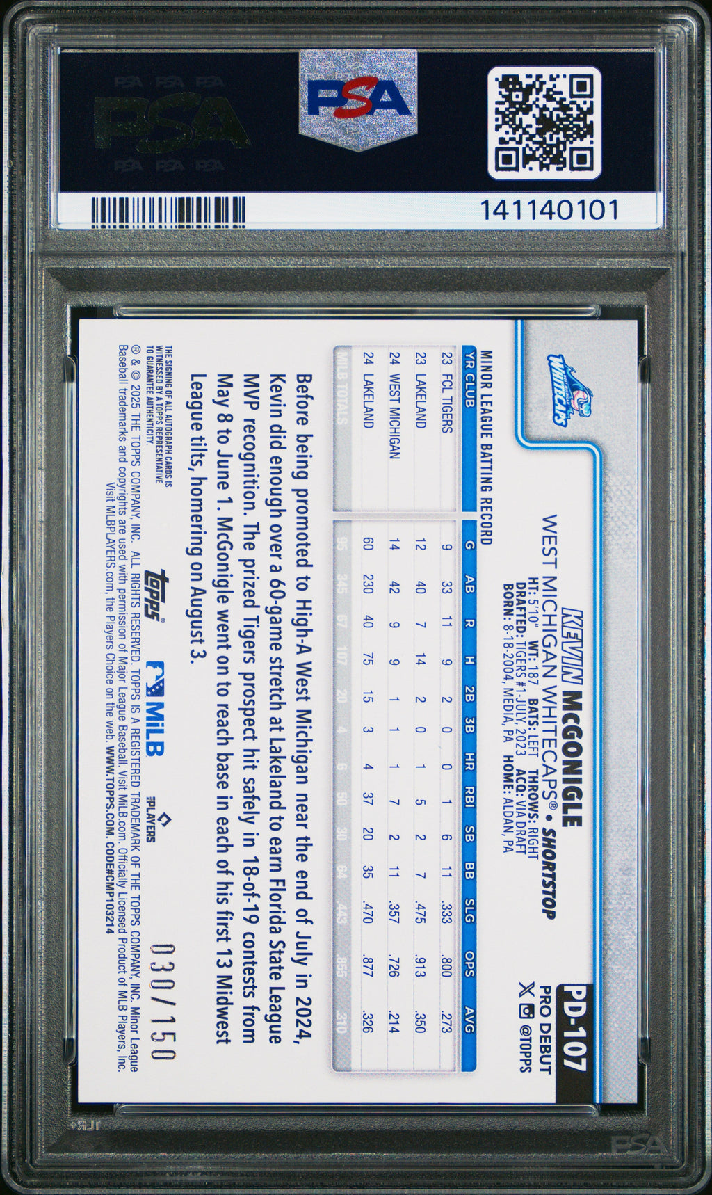 2025 Topps Pro Debut Kevin Mcgonigle Autograph Blue Foil 030/150 #107 PSA 8 Up for grabs is a rare 2025 Topps Pro Debut Kevin Mcgonigle Autograph Blue Foil card, serial numbered 030/150 and graded PSA 8! This standout collectible features a bold on-card autograph from rising star Kevin Mcgonigle of the West Michigan Whitecaps, making it a must-have for serious baseball card collectors and fans. With only one PSA-graded card at this level and just two graded higher, this is an extremely limited opportunity to add a truly unique piece to your collection. The card comes authenticated by Professional Sports Authenticator (PSA) with certification number 141140101, ensuring authenticity and quality. This highly sought-after Blue Foil parallel is part of the 2025 Topps Pro Debut set and boasts special features like serial numbering and a population of just one. Don’t miss your chance to own this eye-catching card before it’s gone! Autographed: Yes Set: 2025 Topps Pro Debut Signed By: Kevin Mcgonigle Certification Number: 141140101 Grader: Professional Sports Authenticator (PSA) Grade: 8 Year Manufactured: 2025 Player/Athlete: Kevin Mcgonigle Serial Number: 030/150 Graded: Yes Sport: Baseball Population Higher: 2 Parallel/Variety: Autograph Blue Foil Manufacturer: Topps Population: 1 Team: West Michigan Whitecaps Features: Serial Numbered Card Number: 107 Listed With Mascot.