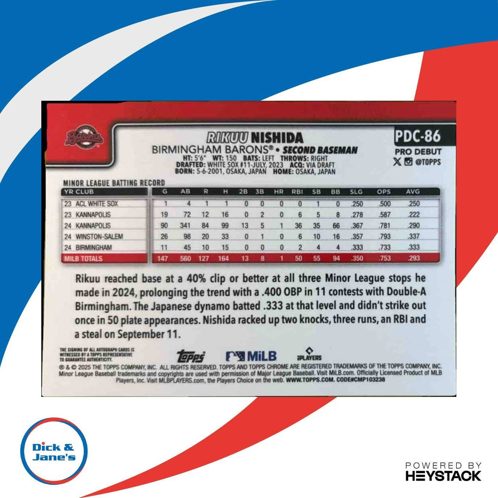 This 2025 Topps Pro Debut Rikuu Nishida Chrome Auto Green /99 trading card features a rare autograph from the rising star of the Birmingham Barons in MLB. Limited to only 99 copies, this card is a must-have for any serious collector looking to add a unique and valuable piece to their collection. Get your hands on this highly sought-after card today! #MLB #TradingCard #Collectible Listed With Mascot.