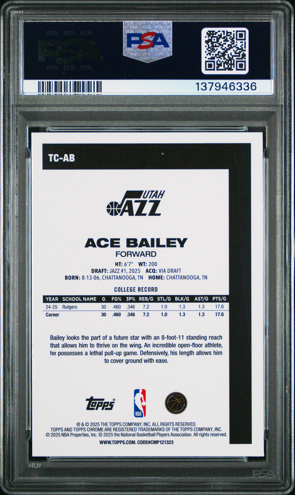 2025 Topps Silver Pack 1980-81 Topps Chrome Basketball Ace Bailey Rookie PSA 8 Don't miss your chance to own this standout 2025 Topps Silver Pack 1980-81 Topps Chrome Basketball Ace Bailey rookie card, professionally graded PSA 8! With only 8 cards at this grade and just 35 graded higher, this rare collectible is a must-have for Utah Jazz and Ace Bailey fans looking to add a high-quality investment piece to their collection. This officially graded card features Ace Bailey's rookie year and comes with full PSA certification (Cert #137946336), ensuring authenticity and value. A true gem for basketball enthusiasts, this card showcases Topps' renowned chrome finish and celebrates one of the most exciting new talents in the sport! Set: 2025 Topps Silver Pack 1980-81 Topps Chrome Basketball Certification Number: 137946336 Grader: Professional Sports Authenticator (PSA) Player/Athlete: Ace Bailey Grade: 8 Year Manufactured: 2025 Graded: Yes Population Higher: 35 Sport: Basketball Manufacturer: Topps Population: 8 Features: Rookie Team: Utah Jazz Card Number: TC-AB Listed With Mascot.