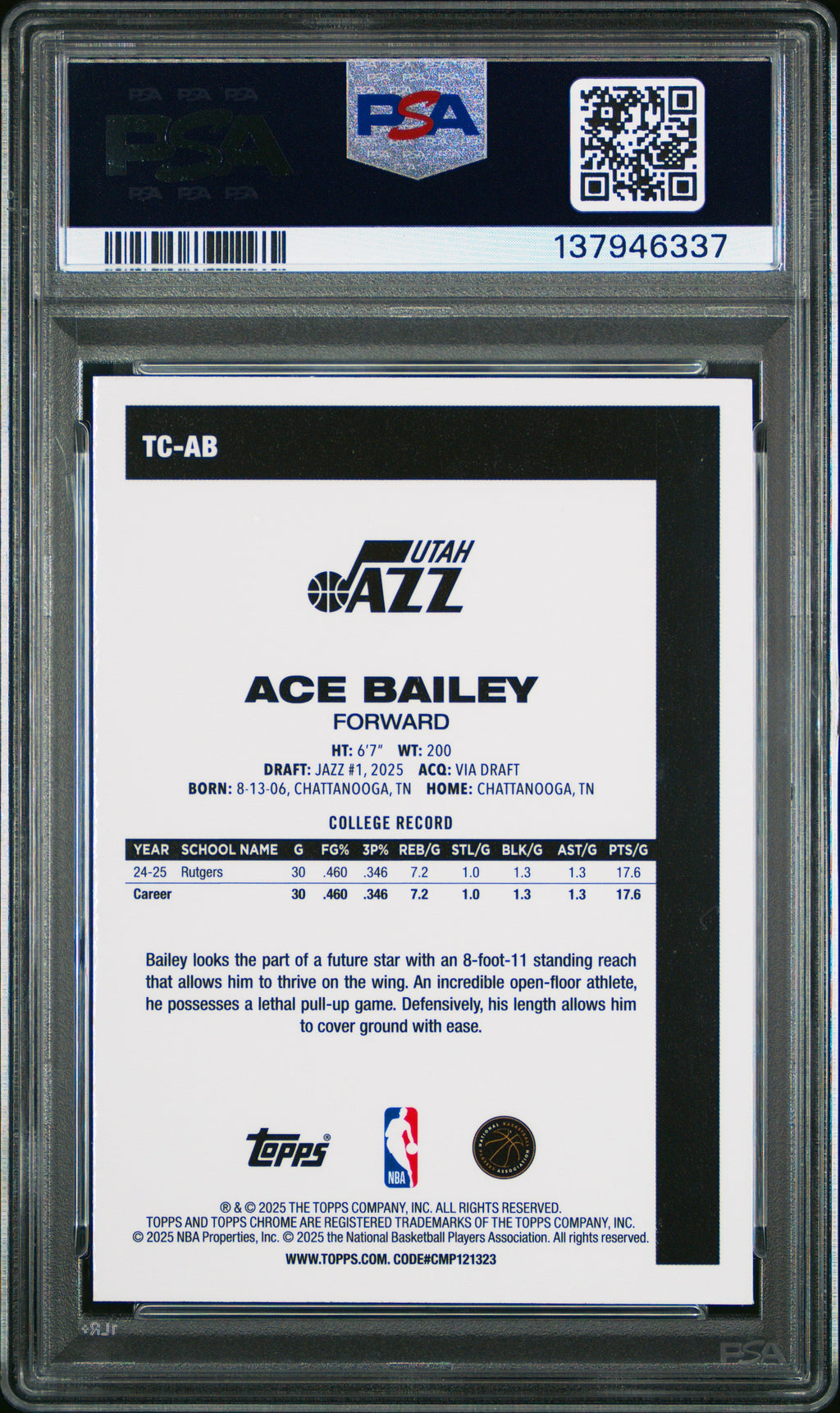 2025 Topps Silver Pack 1980-81 Topps Chrome Basketball Ace Bailey Rookie #TC-AB PSA 9 Utah Jazz Don’t miss your chance to own this standout 2025 Topps Silver Pack 1980-81 Topps Chrome Basketball rookie card featuring Ace Bailey of the Utah Jazz! Professionally graded PSA 9, this card is a must-have for serious collectors and basketball fans alike, especially with only 19 in existence and just 16 graded higher. Add this rare gem to your collection and showcase a true rookie card from one of basketball’s rising stars. This card comes with full PSA certification (number 137946337), ensuring authenticity and quality. Its sleek chrome finish and rookie status make it a highlight piece, perfect for display or investment. Secure this highly sought-after collectible today and elevate your basketball card collection with a premium, graded edition from Topps! Set: 2025 Topps Silver Pack 1980-81 Topps Chrome Basketball Certification Number: 137946337 Grader: Professional Sports Authenticator (PSA) Player/Athlete: Ace Bailey Grade: 9 Year Manufactured: 2025 Graded: Yes Sport: Basketball Population Higher: 16 Manufacturer: Topps Population: 19 Features: Rookie Team: Utah Jazz Card Number: TC-AB Listed With Mascot.