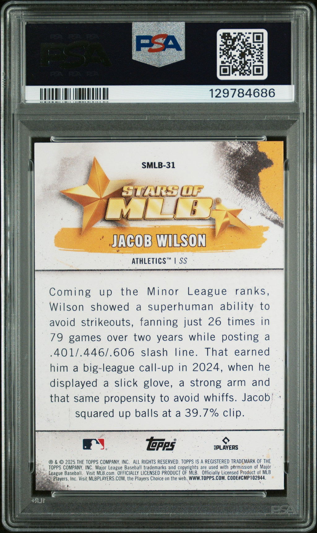 2025 Topps Stars Of MLB Jacob Wilson S2 Rookie Card PSA 10 GEM MINT Oakland Don’t miss your chance to own this stunning 2025 Topps Stars Of MLB Jacob Wilson Series 2 Rookie Card, professionally graded PSA 10 GEM MINT! With a perfect grade and only 60 in existence, this card is a must-have for serious collectors and Oakland Athletics fans. It features Jacob Wilson in his rookie year, making it an incredible investment piece with no higher-graded copies available worldwide. This rare parallel from Topps, certified by Professional Sports Authenticator (PSA), is the ultimate addition to any baseball card collection. Secure a piece of MLB history and celebrate one of the most promising rookies in the game—act now before it’s gone! Set: 2025 Topps Stars Of MLB Certification Number: 129784686 Grader: Professional Sports Authenticator (PSA) Player/Athlete: Jacob Wilson Grade: 10 Year Manufactured: 2025 Graded: Yes Sport: Baseball Population Higher: 0 Parallel/Variety: Series 2 Manufacturer: Topps Population: 60 Team: Oakland Athletics Features: Rookie Card Number: SMLB31 Listed With Mascot.