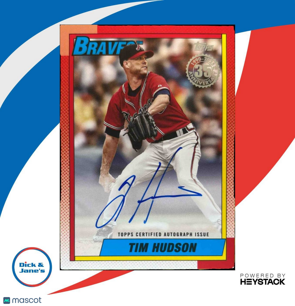 Own a piece of baseball history with this 2025 Topps Tim Hudson 1990 Baseball Auto trading card. Featuring the former Atlanta Braves pitcher, this limited edition card is a must-have for any collector. Get your hands on this rare MLB card before it's gone! Listed With Mascot.