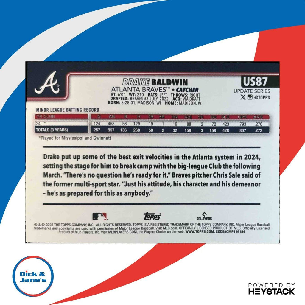 Add the 2025 Topps Update Drake Baldwin Pink Holo Foil #US87 RC Atlanta Braves card to your collection! This rare MLB rookie card features a standout design with a holographic pink finish, making it a must-have for any sports card enthusiast. Don't miss out on this investment-worthy piece! Listed With Mascot.