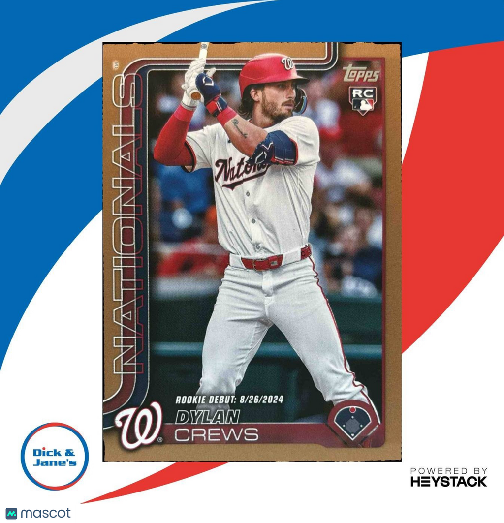 Collect the highly sought-after 2025 Topps Update Dylan Crews Gold Border RC trading card featuring the Rookie Debut of this rising star with the Washington Nationals. Limited to just 2025 copies, this card is a must-have for any baseball card collector or fan of the MLB. Don't miss your chance to own a piece of sports history! Listed With Mascot.
