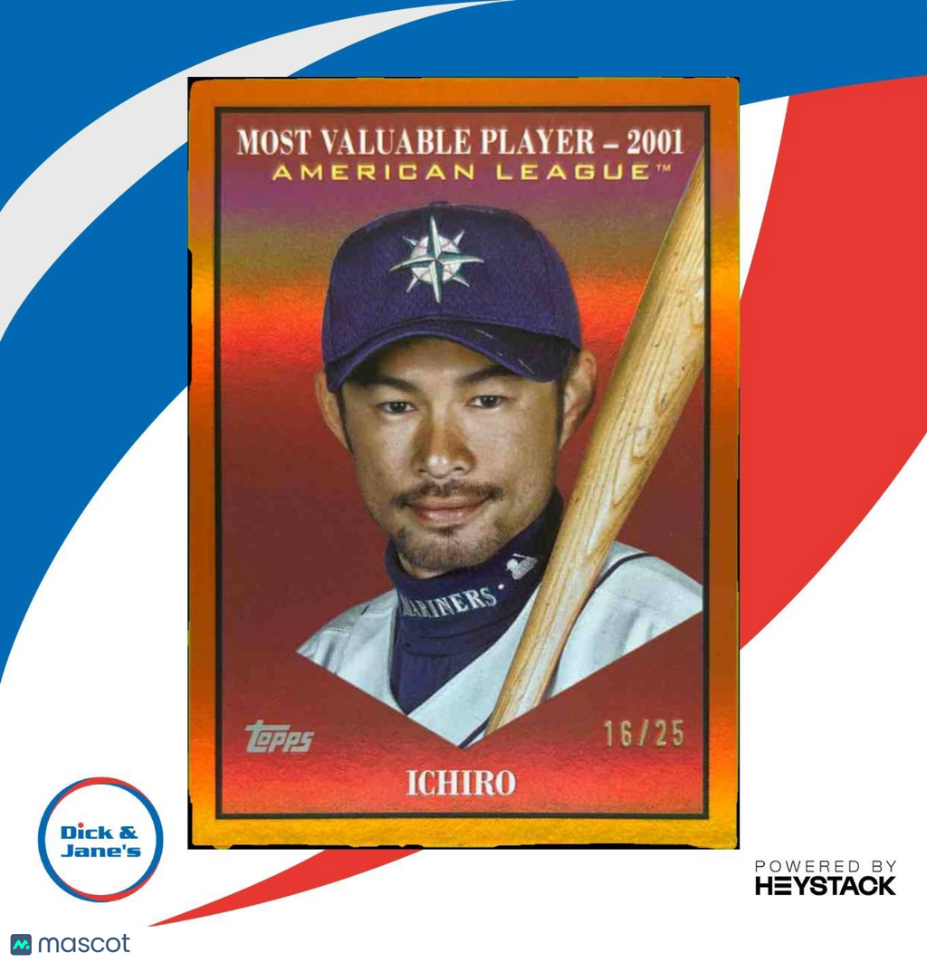 Collectible 2025 Topps Update Ichiro Most Valuable Orange Foil trading card, numbered 16/25. Featuring the legendary Seattle Mariners player in stunning detail. A must-have for any MLB card collector. Rare and highly sought after. Add this gem to your collection today! Listed With Mascot.