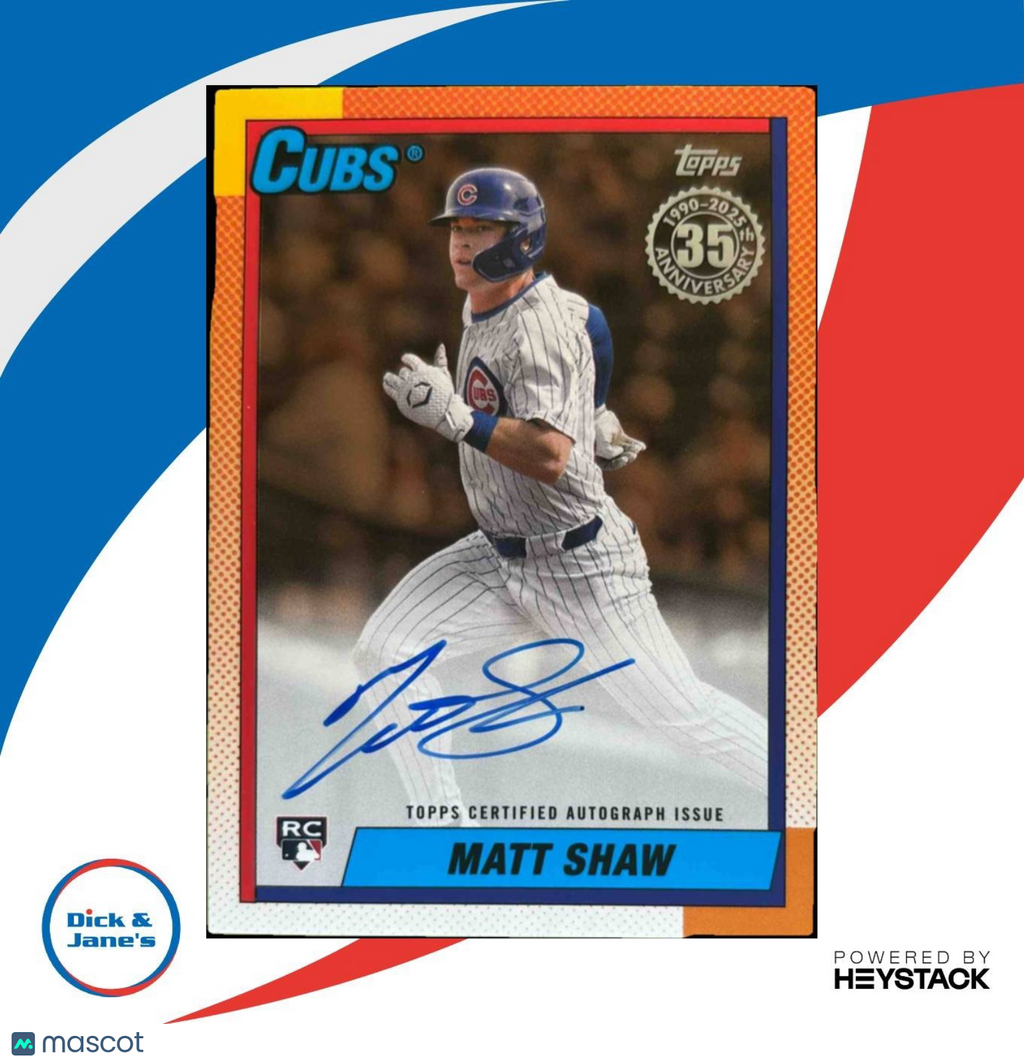 Rare 2025 Topps Update Matt Shaw MLB trading card featuring a gold foil autograph. Limited edition 49/50 card, commemorating his rookie season with the Chicago Cubs. A must-have for any collector or fan of the game. Get your hands on this exclusive piece of baseball history today! Listed With Mascot.