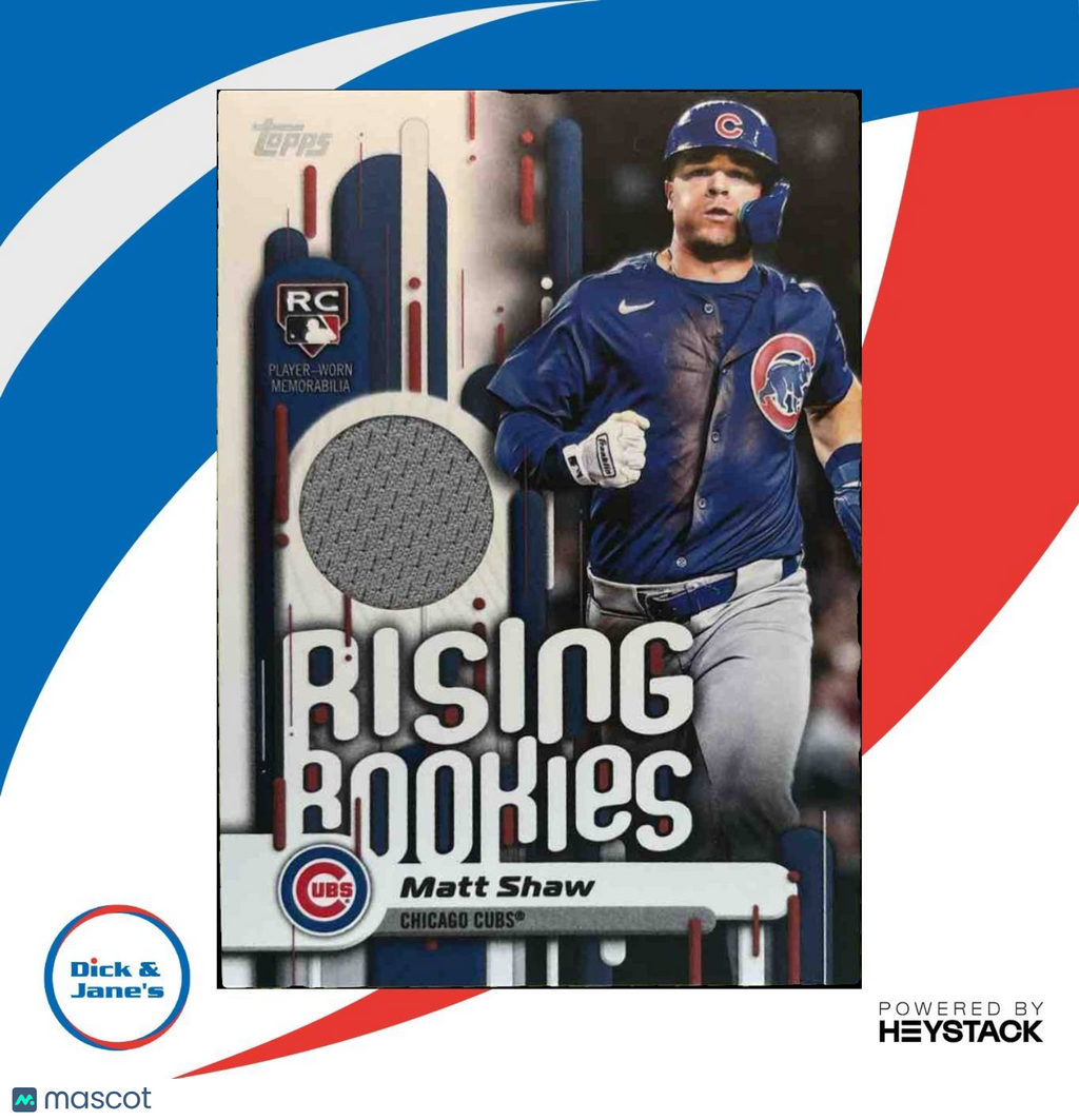 Get your hands on this rare and highly sought after 2025 Topps Update Matt Shaw Rising Rookie Relics #RRR-MS RC MEM Chicago Cubs trading card. Featuring a piece of Matt Shaw's memorabilia, this special MLB card is perfect for collectors and fans alike. Don't miss out on adding this unique item to your collection! Listed With Mascot.