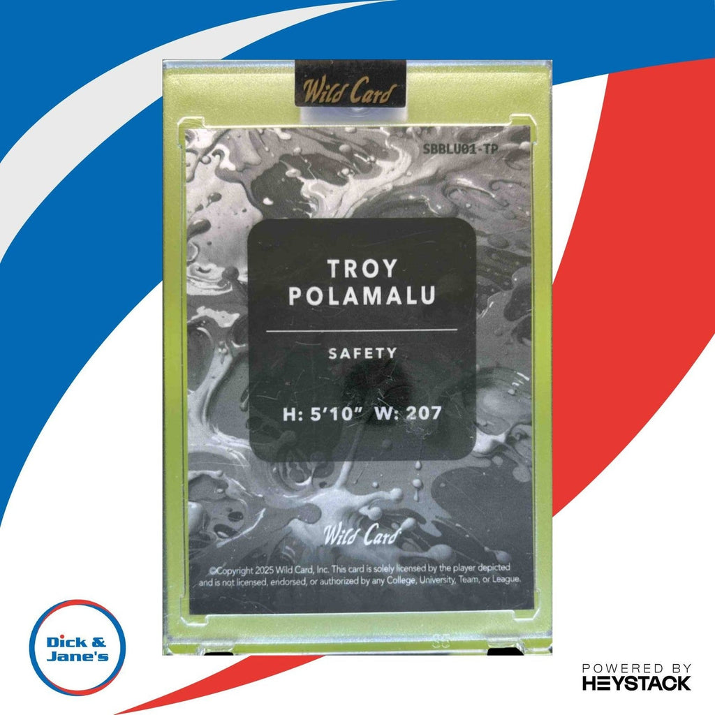 2025 Wild Card SPLAT Troy Polamalu /8 Blue - Steelers: This limited edition NFL trading card features the iconic Troy Polamalu in his Steelers gear. Only 8 of these blue variant cards exist, making it a highly collectible item for any football fan. Don't miss your chance to own a piece of sports history! Listed With Mascot.