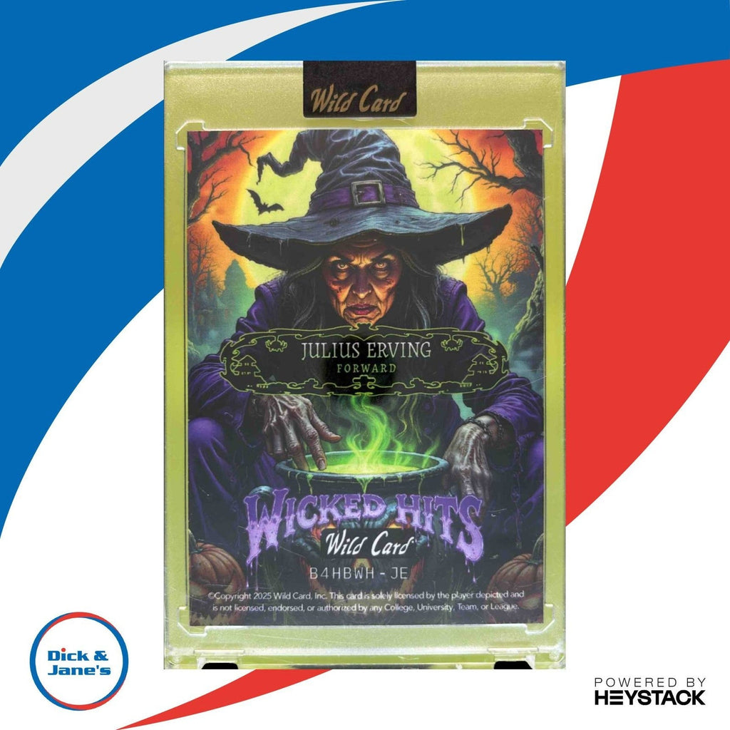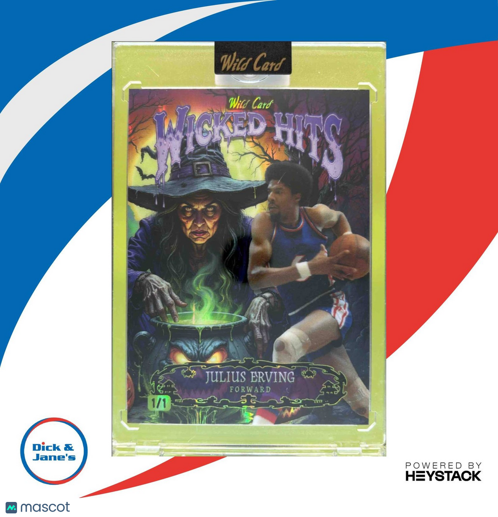 Rare 2025 Wild Card Wicked Hits Julius Erving 1/1 NBA trading card. Limited edition, only one in existence. Featuring iconic Hall of Famer Julius Erving. Perfect addition to any sports card collection. Don't miss out on this highly sought-after card! Listed With Mascot.