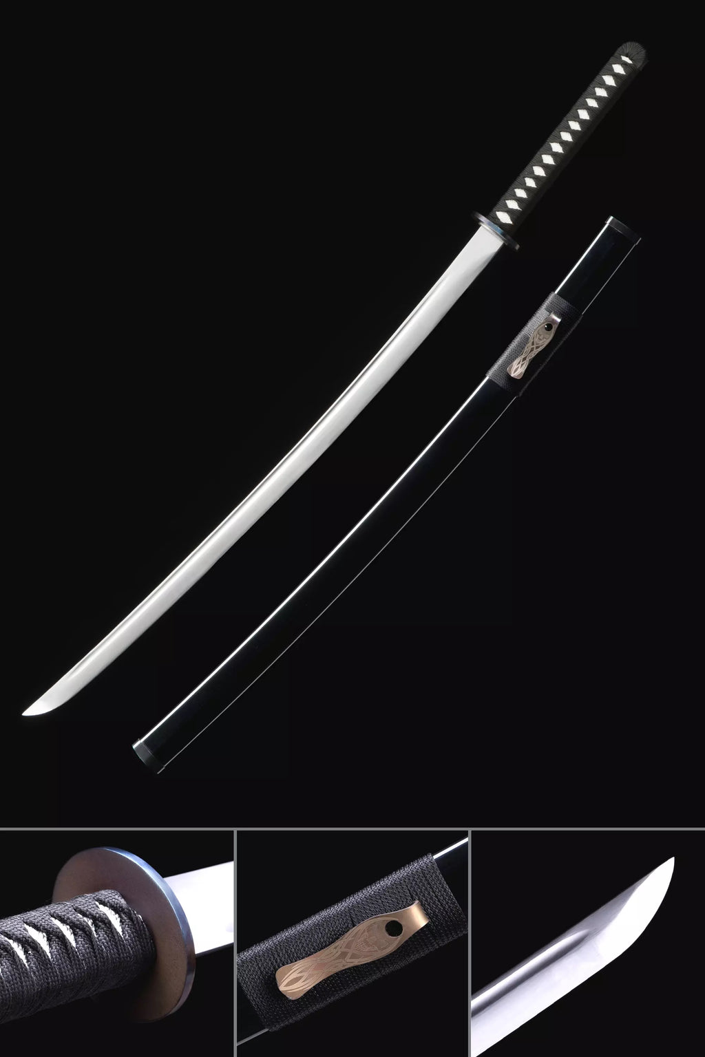 - T10 carbon steel blade, black scabbard, iron tsuba, black cord handle with white ray-skin wrap.