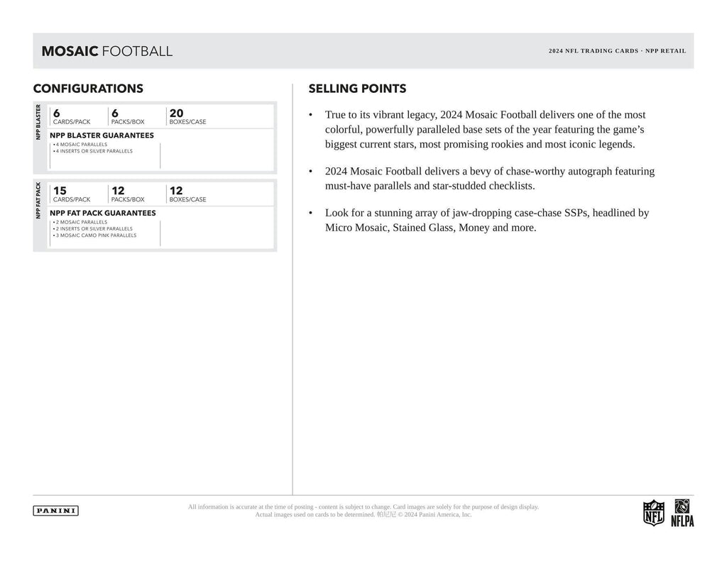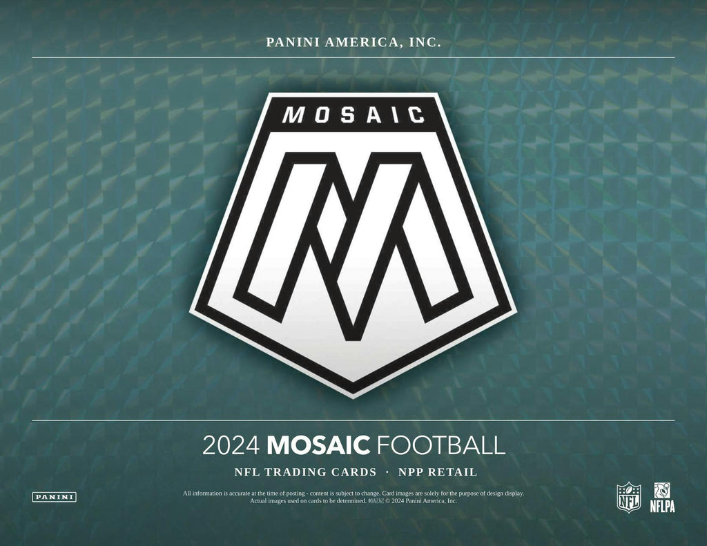 True to its vibrant legacy, 2024 Mosaic Football delivers one of the most colorful, powerfully paralleled base sets of the year featuring the game's biggest current stars, promising rookies, and most iconic legends.
